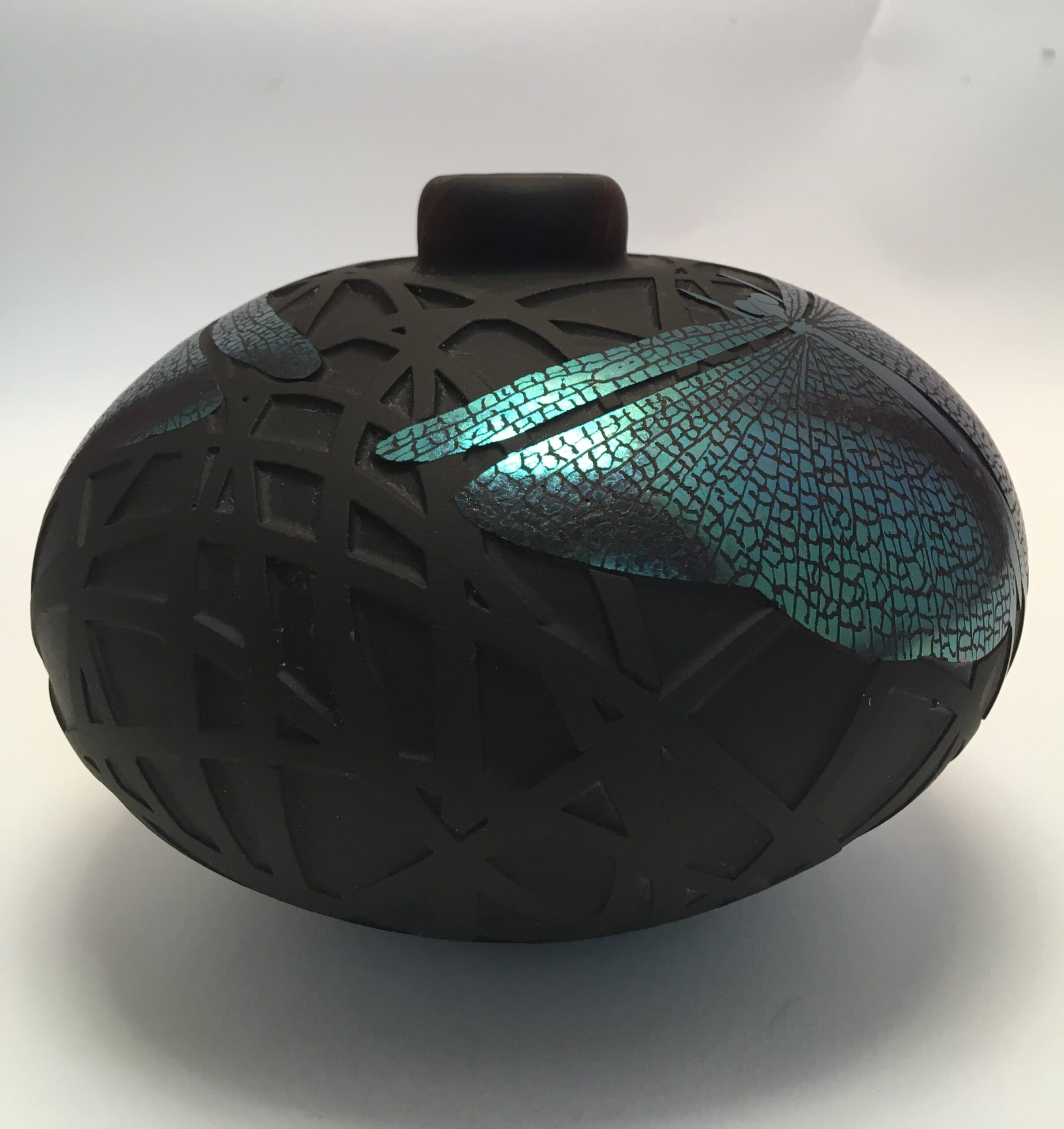 The piece depicts two grasshoppers with their wings spread. They are engraved with a diamond point through fumed glass.
